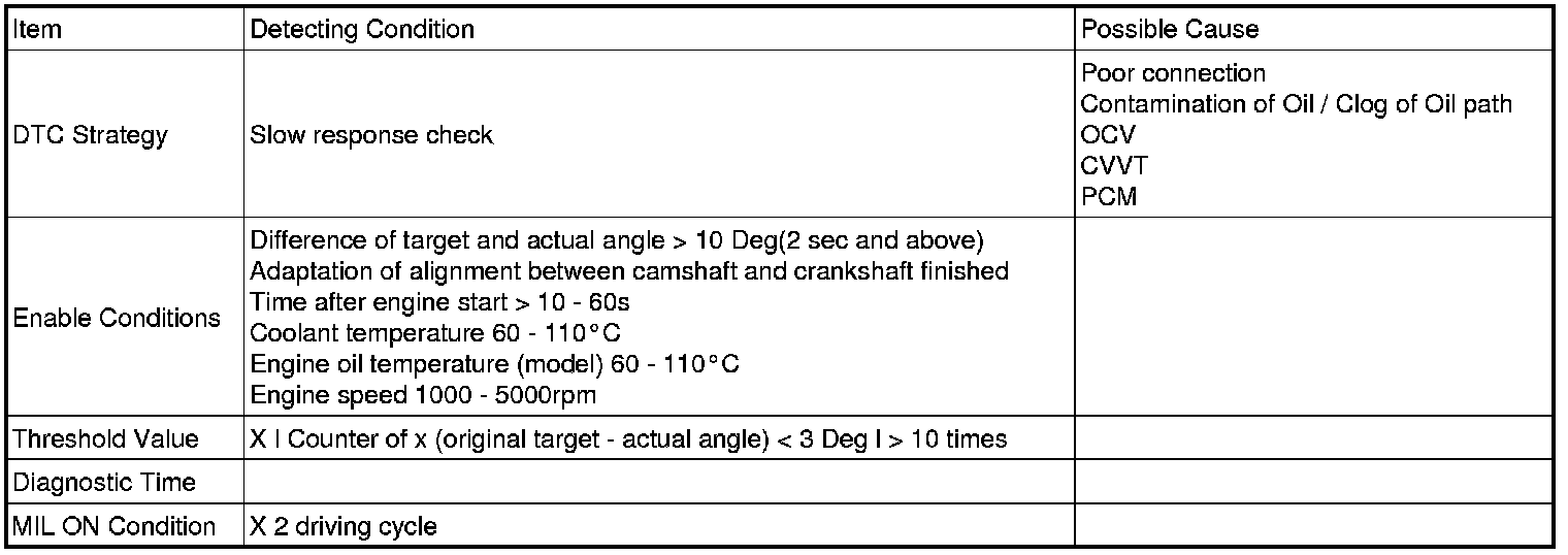 If "Counter of x (original target - actual angle) < 3 Deg" is over 10 times under enable conditions, PCM sets DTC P0011.