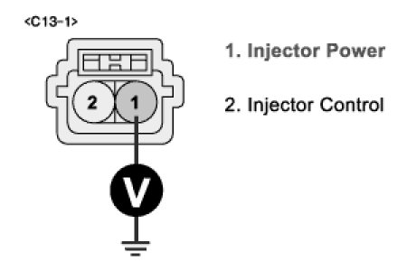 4. Measure voltage between terminal 1 of injector harness connector and chassis ground.