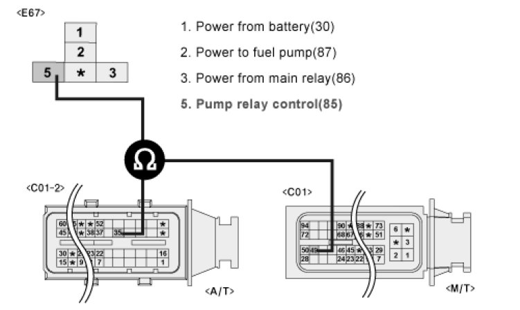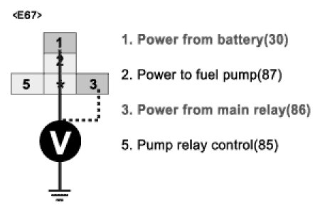1) Check "INJ15A" fuse between fuel pump relay and main relay.