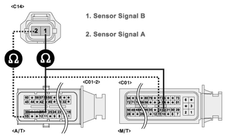 (4) Measure the resistance between terminal 2 of knock sensor harness connector and 15 of PCM harness connector. [A/T]