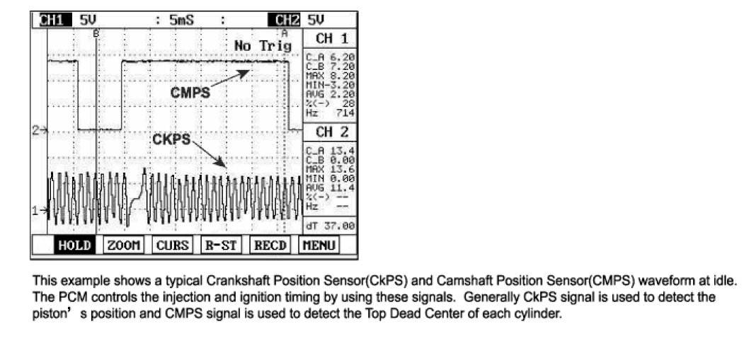 A Crankshaft Position Sensor (CKPS) is a magnetic type sensor that generates voltage using a sensor and a target wheel mounted on the crankshaft; there are 58 slots in the target wheel where one is longer than the others. When the slot in the wheel aligns with the sensor, the sensor voltage output is low. When the metal (tooth) in the wheel aligns with the sensor, the sensor voltage output is high. During one crankshaft rotation there are 58 rectangular signals and one longer signal. The PCM calculates engine RPM by using the sensor's signal and controls the injection duration and the ignition timing. Using the signal differences caused by the longer slot, the PCM identifies which cylinder is at top dead center.