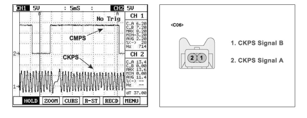 (2) Select "vehicle scopemeter" in the menu, and connect channel A of scantool with terminal 1 of CKPS harness connector.