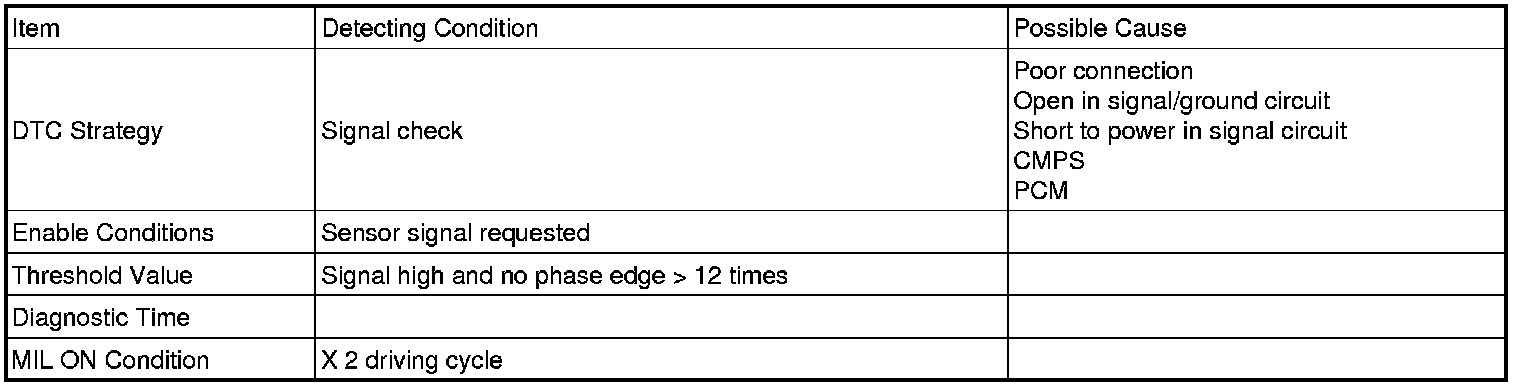 Camshaft Position Sensor (CMPS) is a hall sensor and detects the camshaft position by using a hall element. It is related with Crankshaft Position Sensor (CKPS) and detects the piston position of the each cylinder which the CKPS can't detect. The CMPS are installed on engine head cover and uses a target wheel installed on the camshaft. This sensor has a hall-effect IC which output voltage changes when magnetic field is made on the IC with current flow. When teeth on the target wheel trigger the sensor, output voltage is 12 V. If not, it is 0 V. These CMP signal is sent to the PCM and used for determining the ignition timing along with CKP signal. CMPS makes Sequential Injection possible.