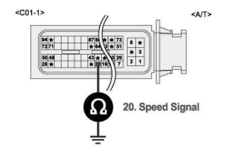 (4) Measure resistance between terminal 20/C01-1 of PCM harness connector and chassis ground. [A/T]