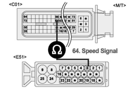 Measure resistance between terminal 64/C01 of ECM harness connector and terminal 3/E51 of ABS control module harness connector. (M/T)