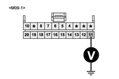 3. Measure the voltage between terminal 11/M09-1 of harness connector and ground.