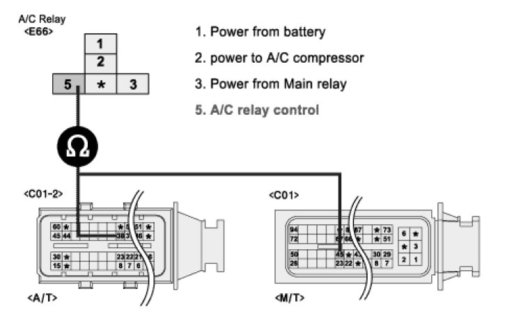 Measure the resistance between terminal 5 of A/C relay harness connector and terminal 45/C01of PCM harness connector. (MT)