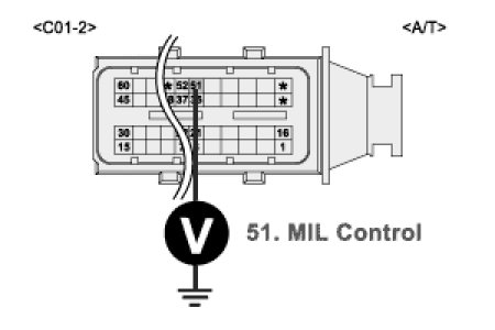 4. Measure the voltage between terminal 51/C01-2 of PCM harness connector and chassis ground. [A/T]