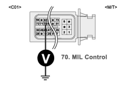 Measure the voltage between terminal 70/C01 of ECM harness connector and chassis ground. [M/T]