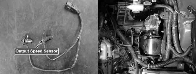 The OUTPUT SPEED SENSOR (PG-B) outputs waveform signals according to the revolutions of the output shaft of the transmission. The OUTPUT SPEED SENSOR (PG-B) is installed in front of the Transfer Drive Gear and determine the Transfer Drive Gear rpms by calculating the frequency of the pulses. This value, together with the throttle position data, is mainly used to decide the optimum gear position.