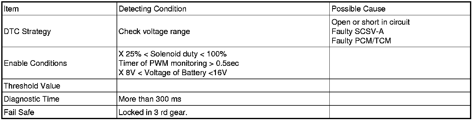 The PCM/TCM checks the Shift Control Solenoid Valve A control signal by monitoring the feedback signal from the solenoid valve drive circuit. If an unexpected signal is monitored, (For example, high voltage is detected when low voltage is expected, or low voltage is detected when high voltage is expected) the TCM judges that SCSV A control solenoid circuit is malfunctioning and sets this code.