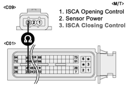 Measure the resistance between terminal 3 of ISCA harness connector and terminal 25/C01 of ECM harness connector. [M/T]