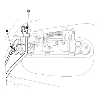 4. Disconnect the lock cable(A), out side handle cable(B).