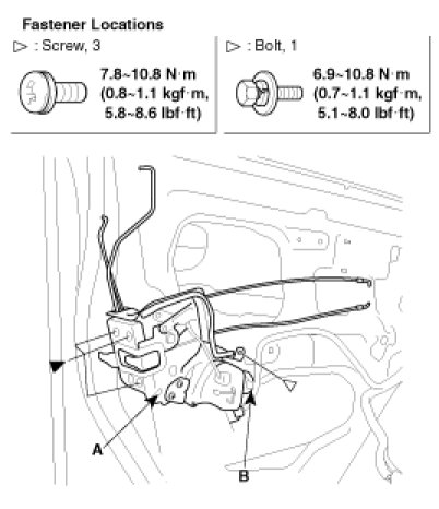 5. After disconnect the connector(B), loosen the mounting bolts. Remove the latch assemble(A).