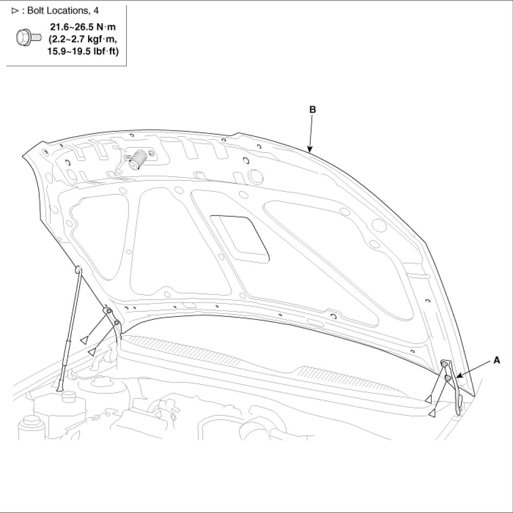 2. After loose the hood hinge (A) mounting bolts, remove the hood (B).