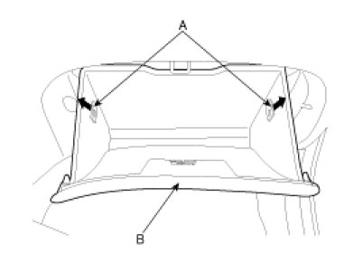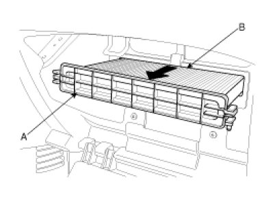 1. Open the glove box (B). Lower the glove box down completely by removing the glove box stopper (A) to the glove box.