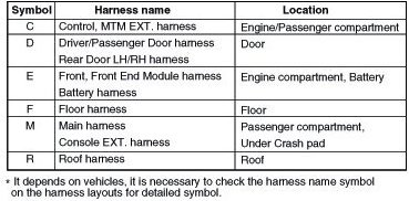 A connector identification symbol consists of a wiring harness location classification symbol corresponding to a wiring harness location and number corresponding to the connector.
