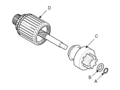 10. Remove the stopper (A), stop ring (B), overrunning clutch (C) and armature (D).
