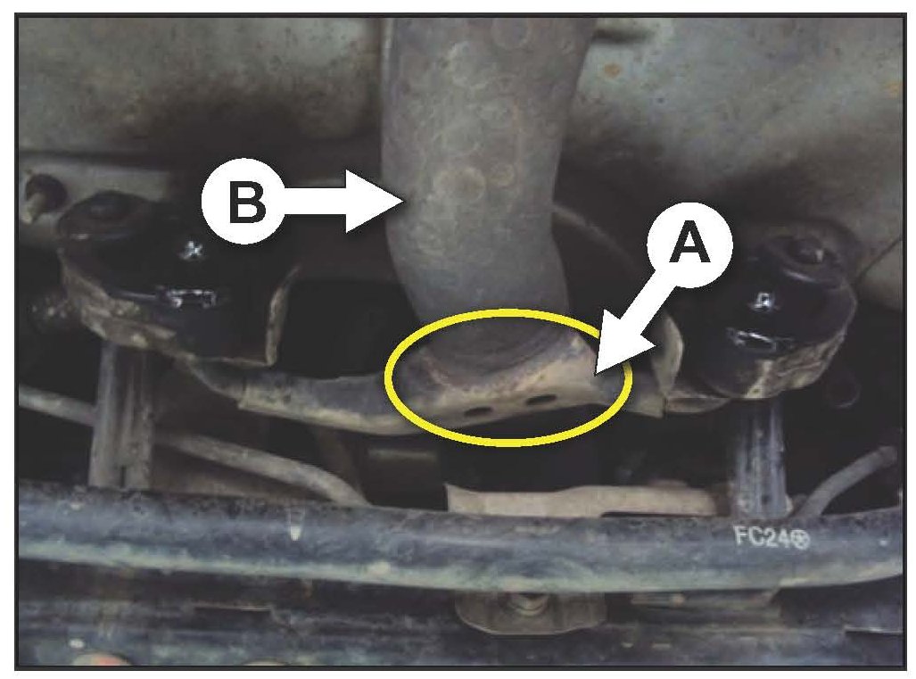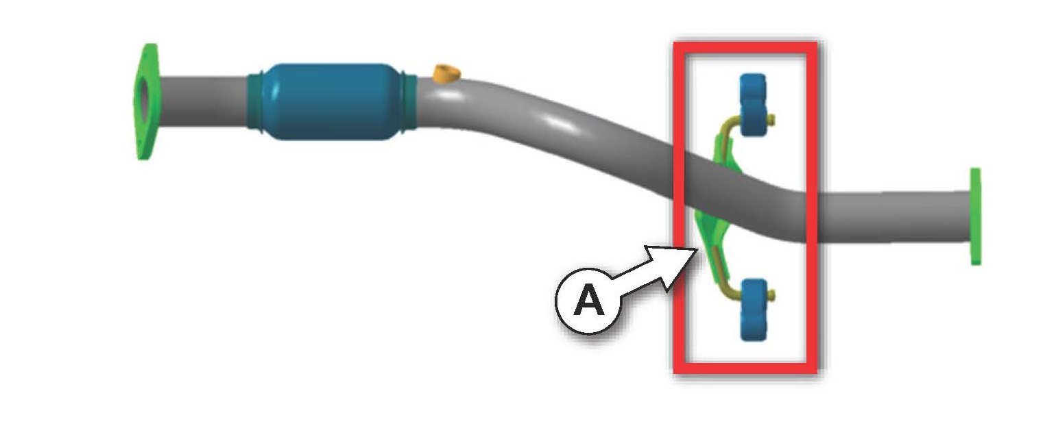 Some Rio vehicles produced from February 25, 2008 to July 10 2011 may experience a rattling noise while driving emanating from under the vehicle This condition may be due to the separation of the front muffler pipe hanger bracket (A) from corrosion. Inspect the front muffler pipe hanger bracket to verify partial or complete separation from the muffler pipe and confirm this as the source for the noise concerns