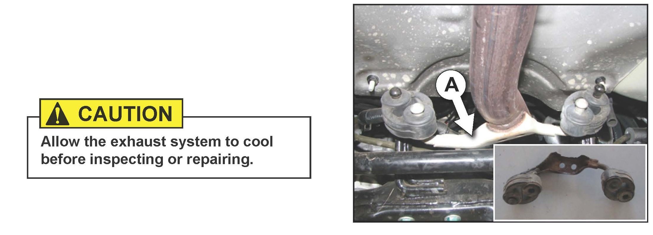 Locate the front muffler pipe hanger bracket (A). Photo insert shows an old, damaged hanger bracket