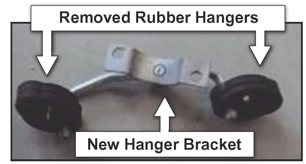 Install the removed rubber hangers onto the new front muffler pipe hanger bracket as shown