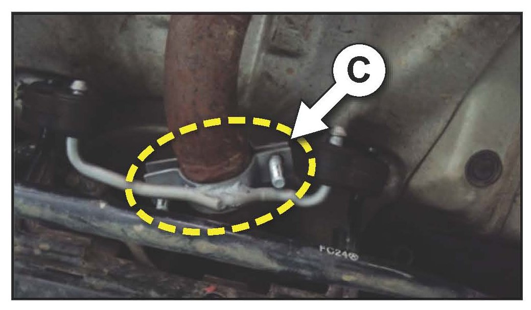 2. Install the new front muffler pipe hanger bracket (C) over the origins mounting ocation (between existing welds)