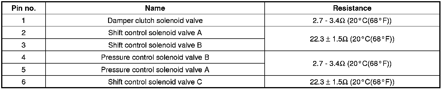 5. Measure the resistance between terminals of the solenoid valve connector on the transaxle case.