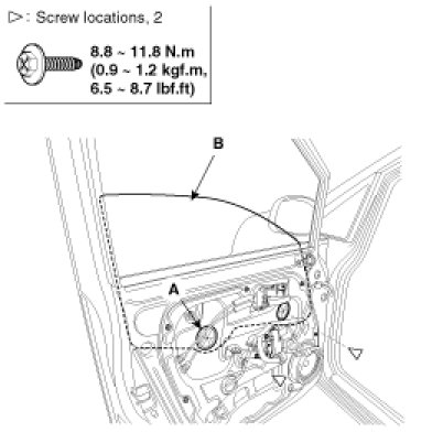 3. Carefully move the glass (B) until you can see the bolts, then loosen them. Separate the glass from the glass run and carefully pull the glass out through the window slot.