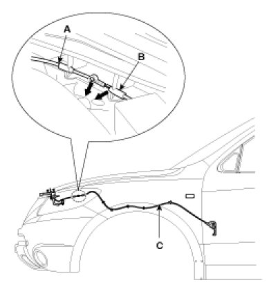 3. Remove the hood latch cable (C).