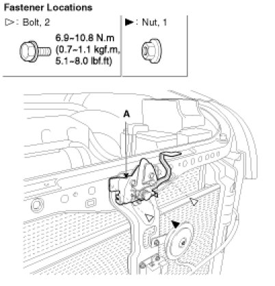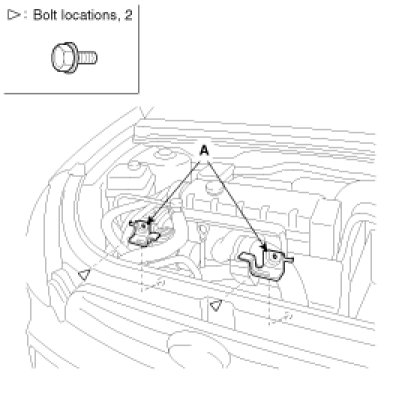 5. Remove the hood latch (A) mounting bolts.