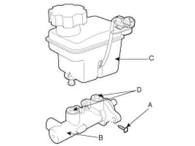 6. Install the reservoir (C) to the master cylinder (B) and tighten the screw (A).