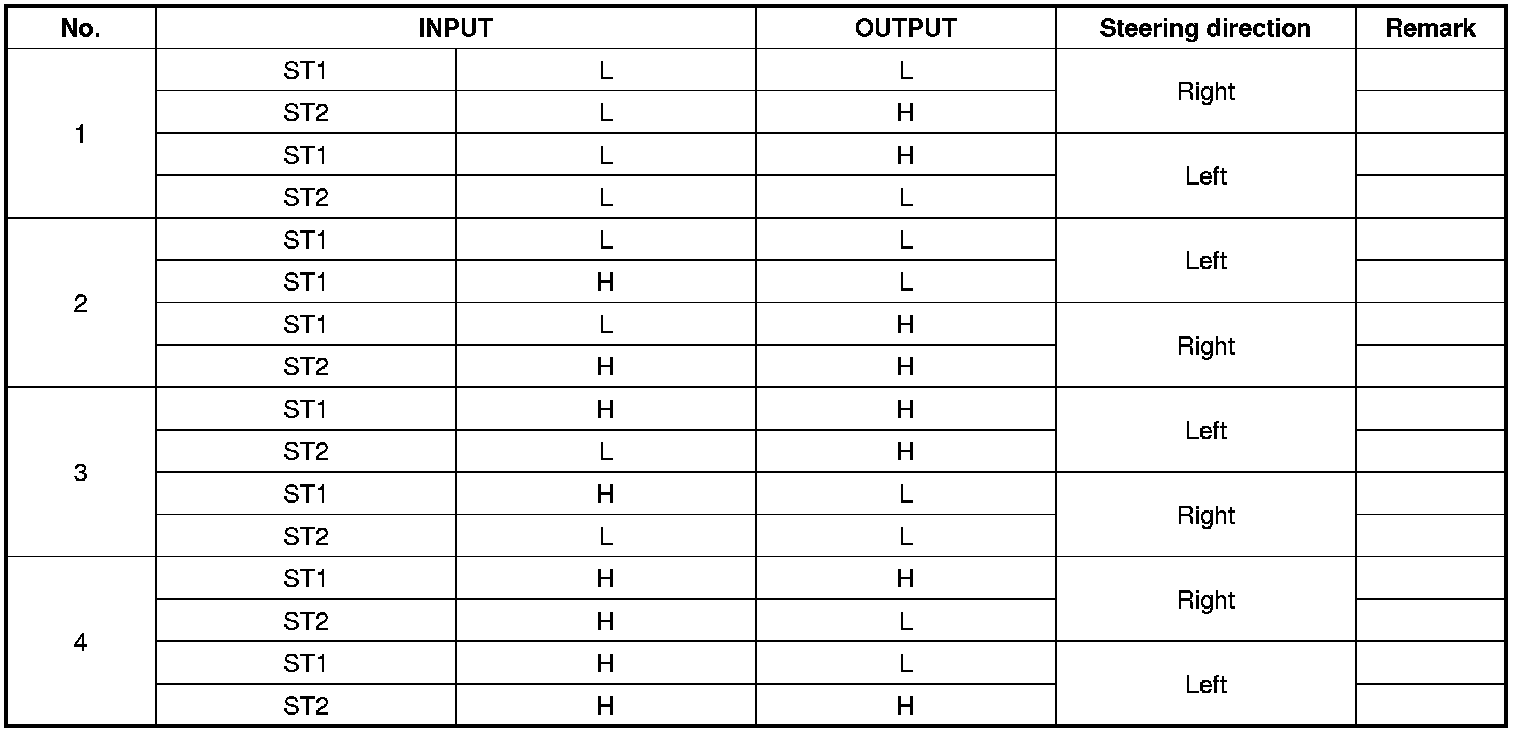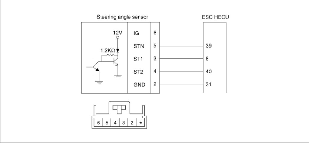 The split of the steering angle sensor detects a steering angle of the steering wheel by a ON/OFF pulse caused by whether or not the LED lights go through the hole of the split, rotating as the steering wheel revolves. There are three LEDs, two(ST1, ST2) for detecting a steering direction, and the other for the neutral position.The HECU calculates the steering angle by the pulse from the steering angle sensor.