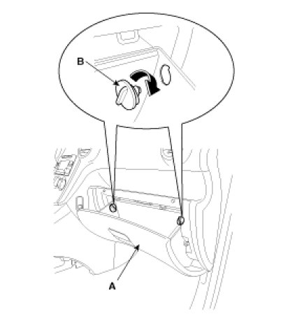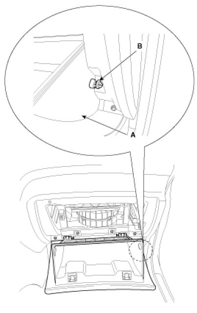 1. Open the glove box (B). Lower the glove box down completely by removing the glove box stopper (A) to the glove box.