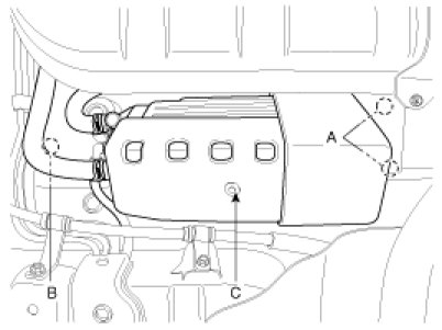 2. Unscrew the canister mounting bolts (A) and nut (B), and then remove the canister (C) from the vehicle.