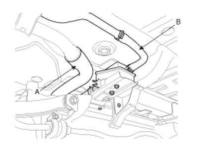 5. Disconnect the fuel filler hose (A) and vent hose (B).
