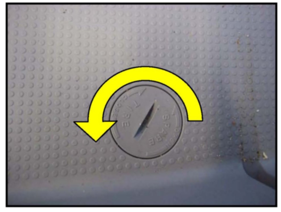The spare tire release knob is located in the rear cargo box. Turn this knob counter-clockwise to drop down the spare tire.