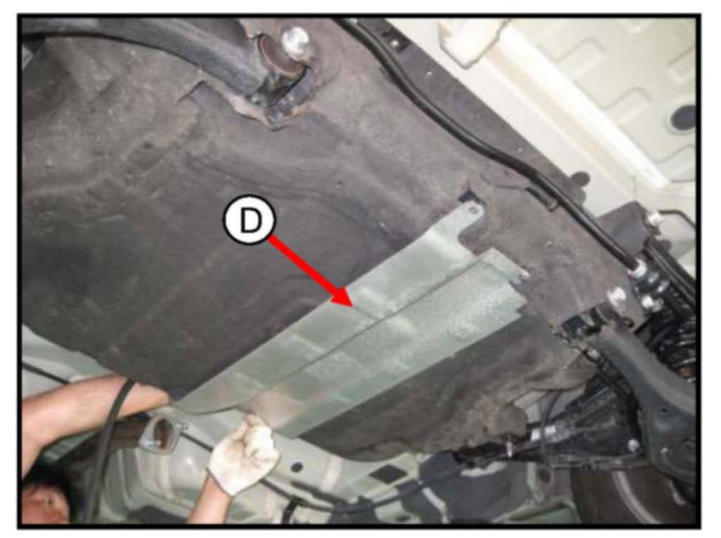 4. Remove the four (4) 10 mm fuel tank heat protector bolts and the remove the fuel tank heat protector (D) as shown in the photo.