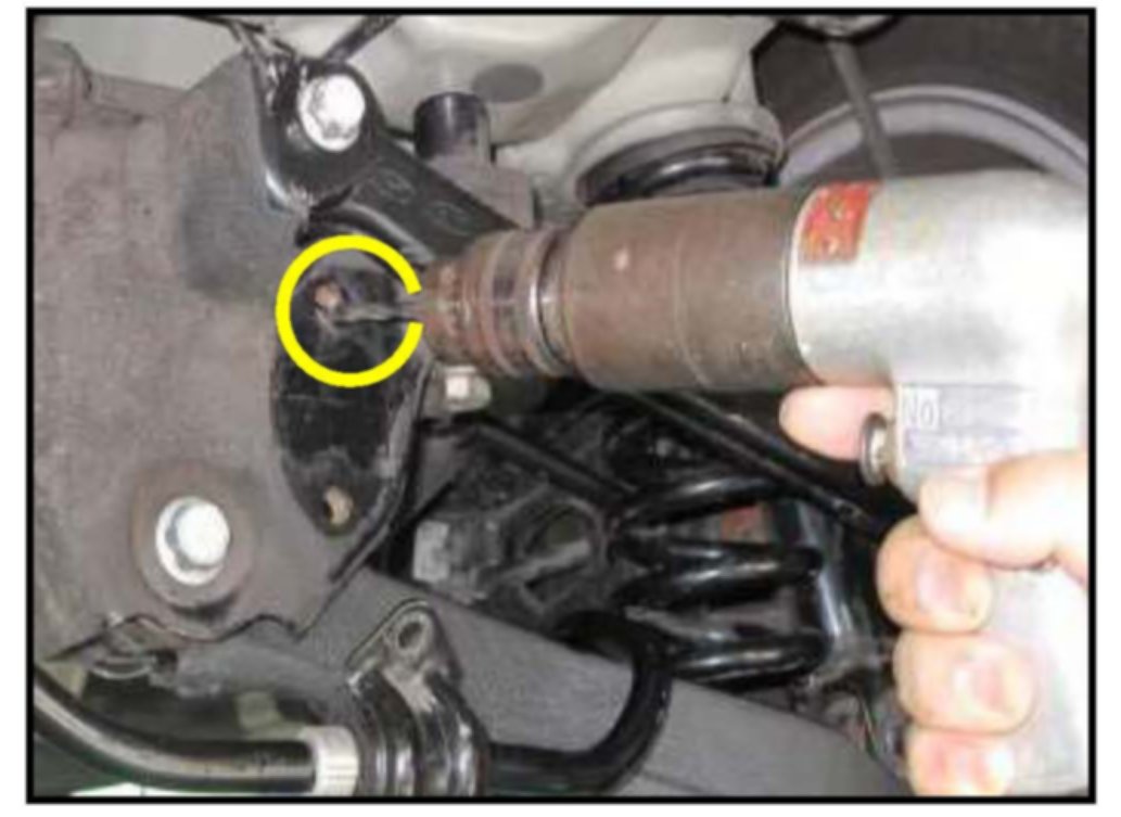 6. Use a 5 mm drill bit to drill a hole in the rear cross member through the stabilizer bar mounting upper hole on the right side.