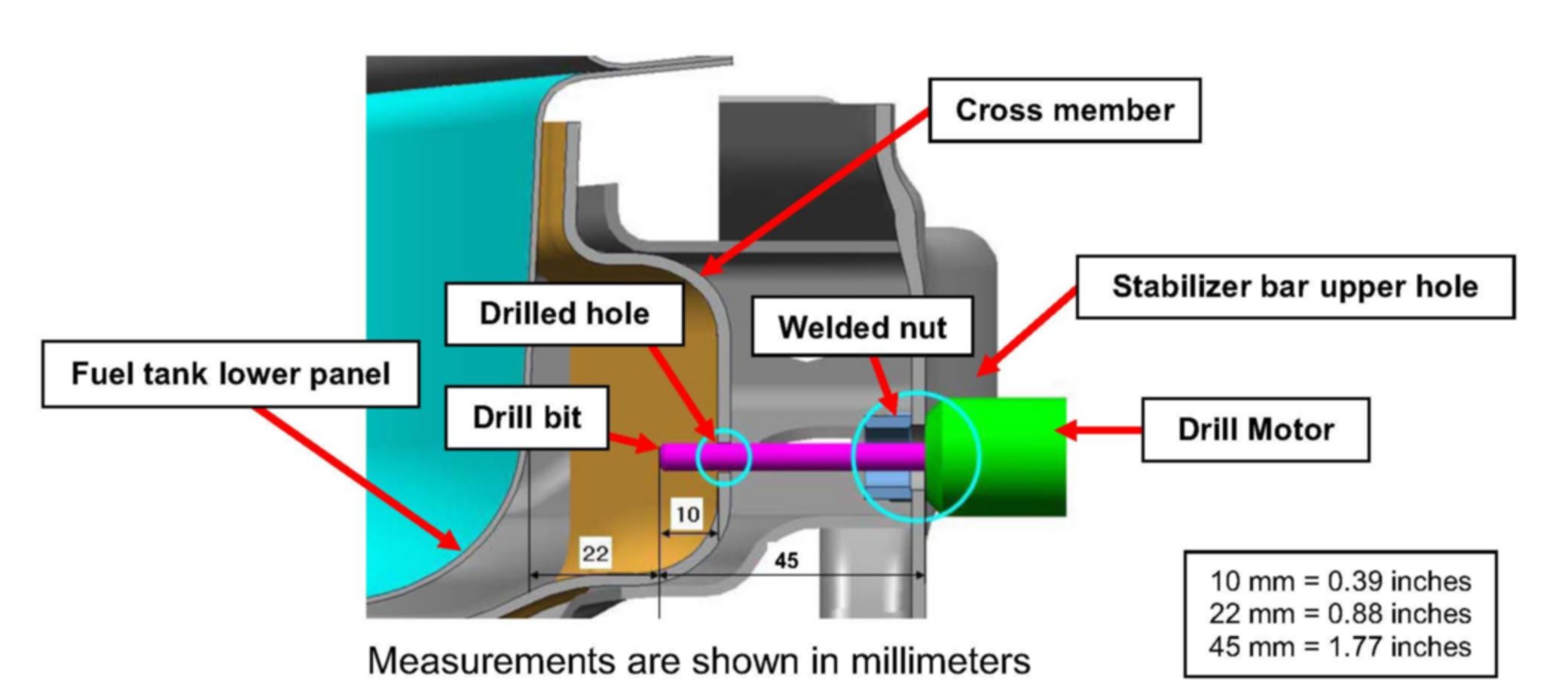 Adjust the length of the exposed drill bit to approximately 1-3/4 inches (45 mm). If length is over 1-3/4 inches (45 mm), damage may occur to the fuel tank lower panel when drilling.