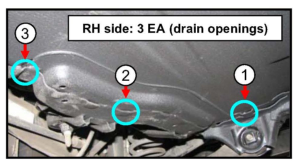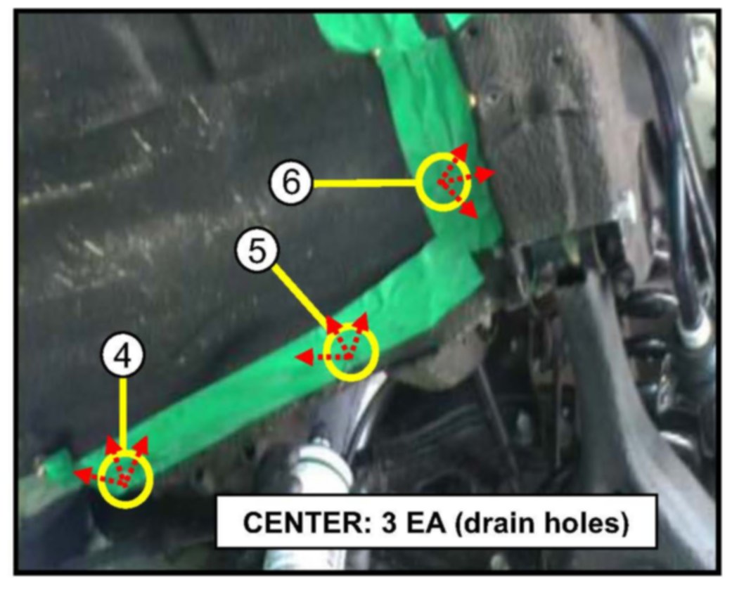 Before spraying cavity wax, block the (LH, RH and Center) drain openings (used for blowing out foreign materials and debris in the previous procedure) as shown in the photo using the tape supplied in the tool kit. This is to avoid wax from flowing down through the holes while spraying wax.