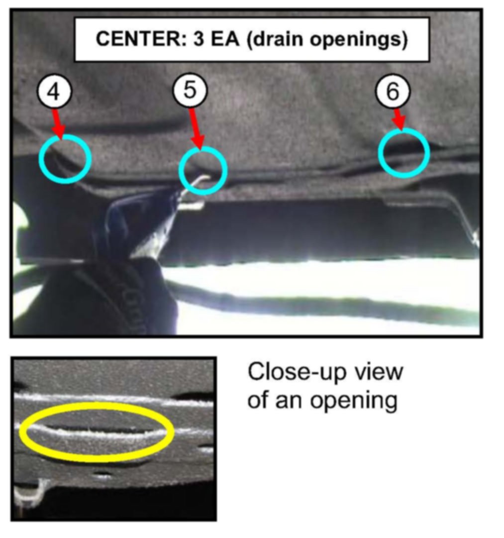 15. Cut holes in the tape for the nine (9) drain openings shown above prior to applying cavity wax. You will be spraying cavity wax through these openings.