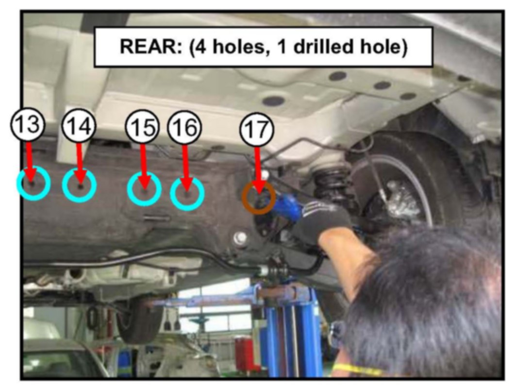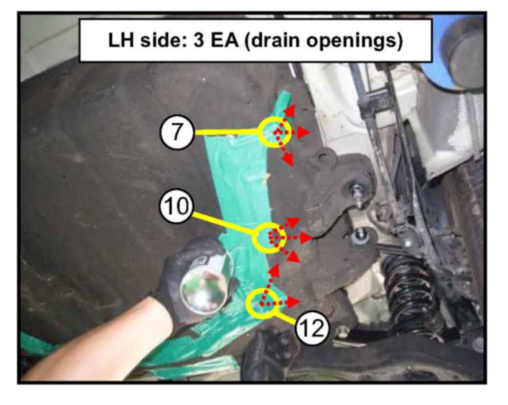 16. Spray cavity wax through the twelve (12) holes indicated in the photo above. Three (3) cavity wax aerosol cans are required to perform this task per vehicle, so use one (1) can of cavity wax per four (4) openings.