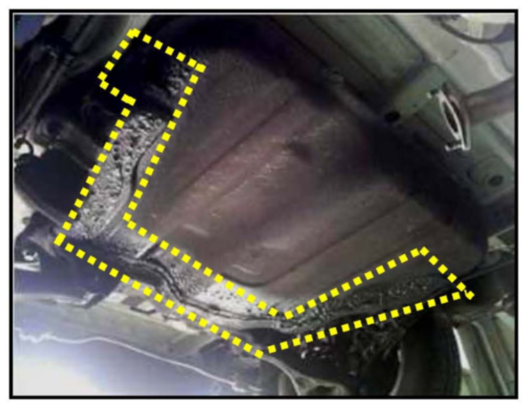 23. Spray black undercoating wax around the drain holes on the bottom of the fuel tank as indicated in the photo.