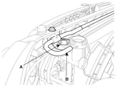 3. Install the radiator bracket(A) mounting bolt and coolant bleed hose(B).