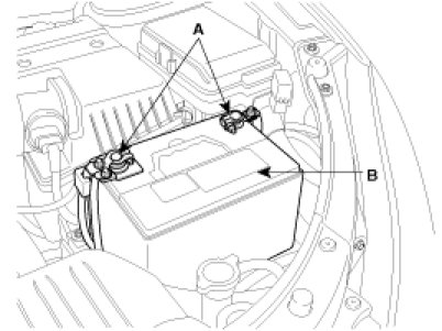 3. Disconnect the battery negative terminal(A) first, then the positive terminal. Remove the battery(B).