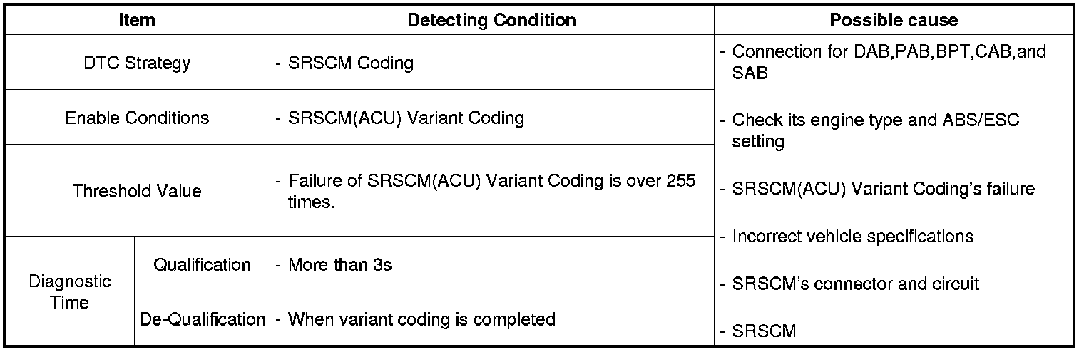 In order to run the airbag system normally, check if there is an incorrect vehicle specifications at performing SRSCM (ACU) Variant Coding. This DTC is set up when SRSCM (ACU) Variant Coding is not done over 255 times.