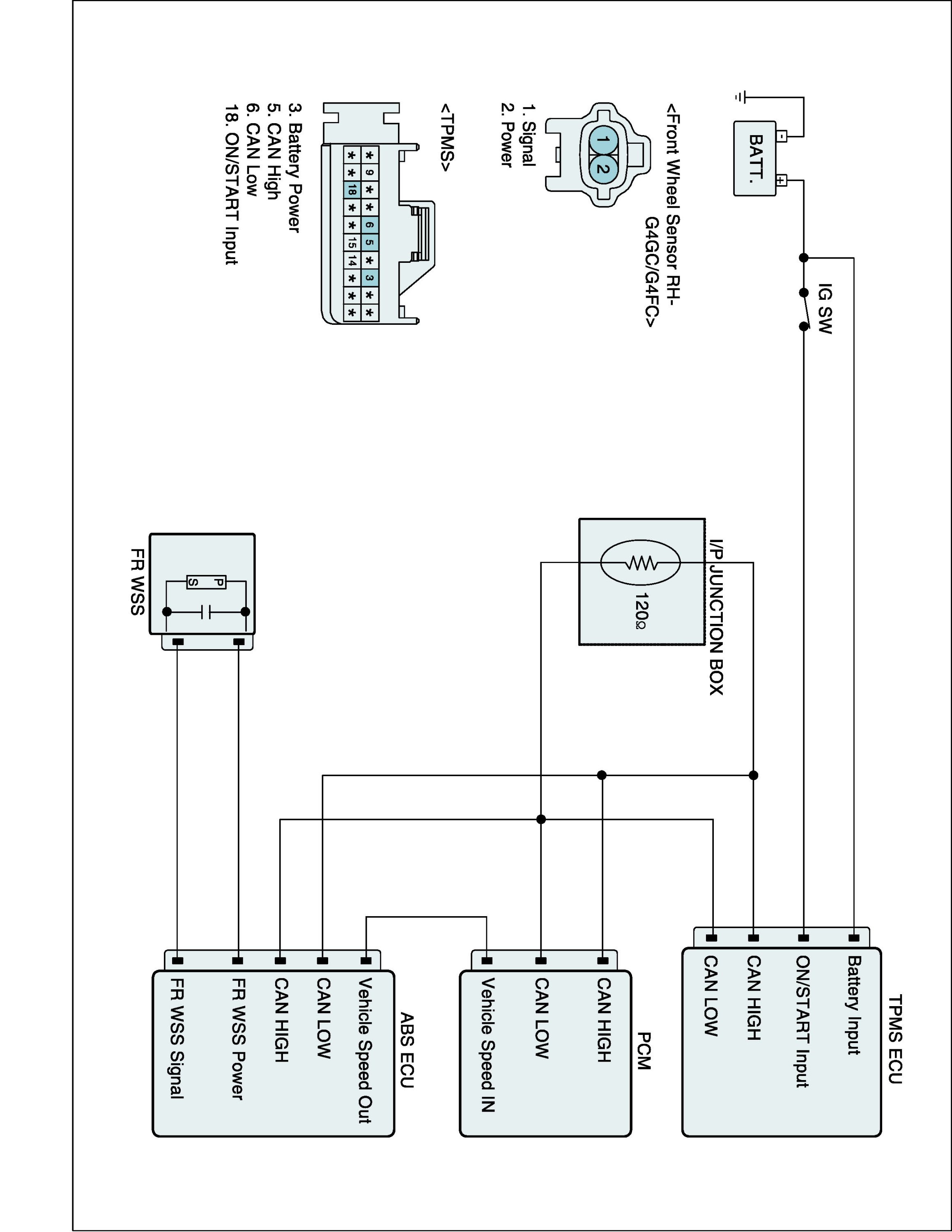 Various TPMS functions rely on a speed signal that reports reliably actual vehicle speed. Three speed signals (ABS1 FR wheel, EMS1 speed signal, TCS5 FR wheel) compared since one signal alone may report incorrect vehicle speed which would go undetected. Three signals must report same vehicle speed. If not, a DTC shall be set to active, and TPMS Warning indicator shall turn on.