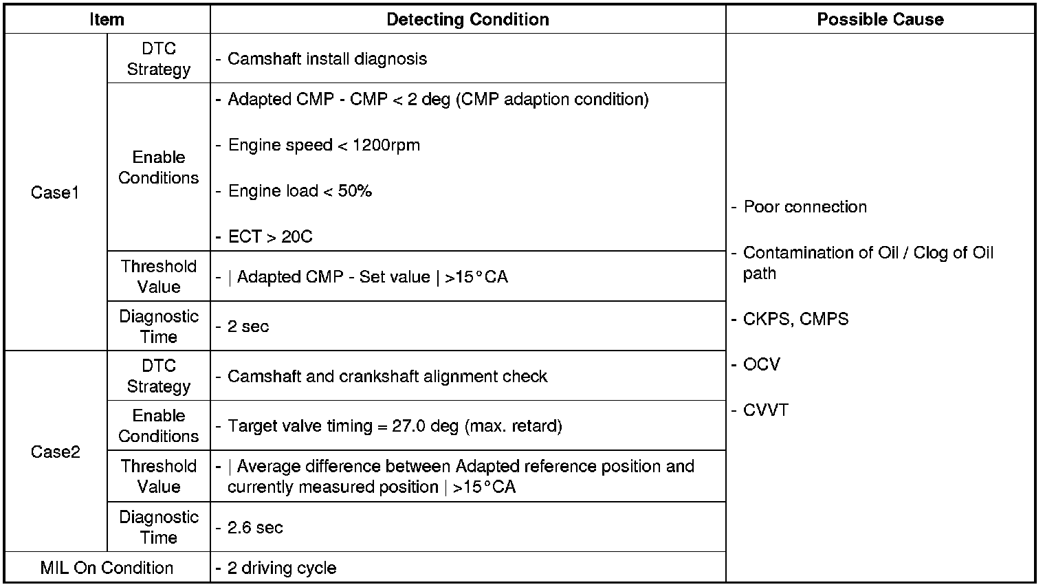 If the deviation between CKPS and CMPS is bigger than the threshold value, ECM sets DTC P0016.