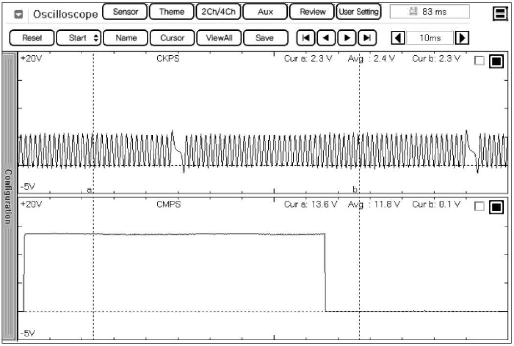 This example shows a typical Crankshaft Position Sensor (CkPS) and Camshaft Position Sensor (CMPS) waveform at idle. The ECM controls the injection and ignition timing by using these signals. Generally CkPS signal is used to detect the piston's position and CMPS signal is used to detect the Top Dead Center of each cylinder.