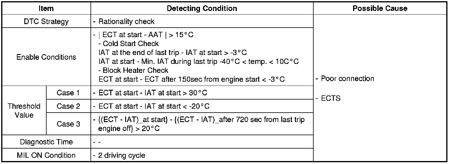 Checking the engine coolant temperature under detecting condition, if the difference between its current temperature and startup temperature is less than threshold value over predeterminated period, ECM sets P0115.